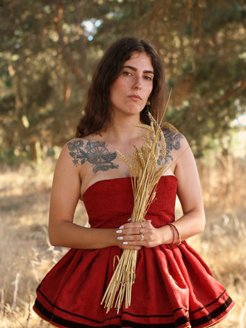 Para acompañar la lámina, presentamos un traje de serrana reinterpretado que transforma el conjunto que suelen llevar en escena (camiseta blanca y pantalón negro) en un look con un fuerte componente narrativo: un corpiño blanco estampado con las portadas de sus discos y una falda negra con seis franjas, cada una dedicada a un álbum de su trayectoria, incluido el que está por salir.